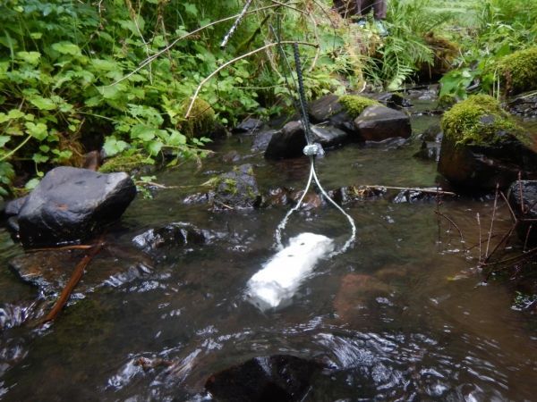Researchers use thermistors in a PVC housing to monitor stream temperatures (Photo Credit: Kevin Bladon)