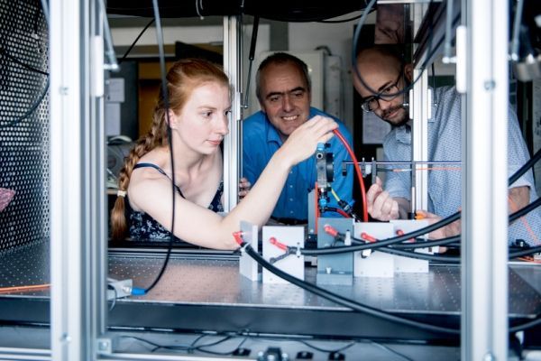 Katharina Grosse, Achim von Keudell and Julian Held (from the left) in the laboratory. (Photo Credit: RUB, Kramer)