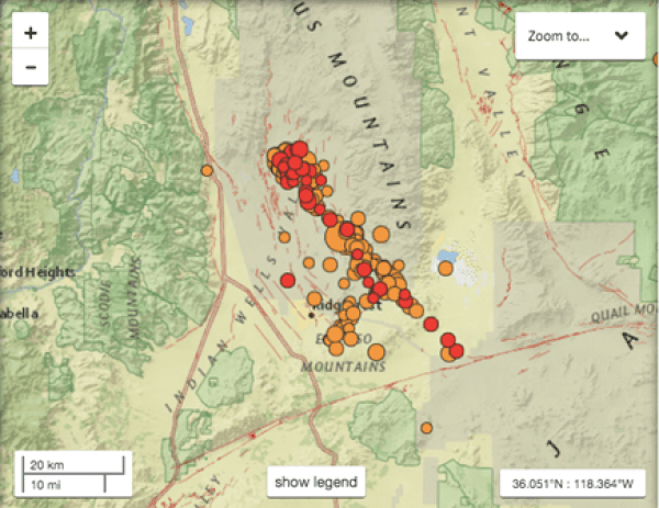 A magnitude 7.1 earthquake struck southern California on July 5, 2019 at 8:20 pm local time (03:20 UTC). This event was centered near the July 4, 2019 M6.4 earthquake.