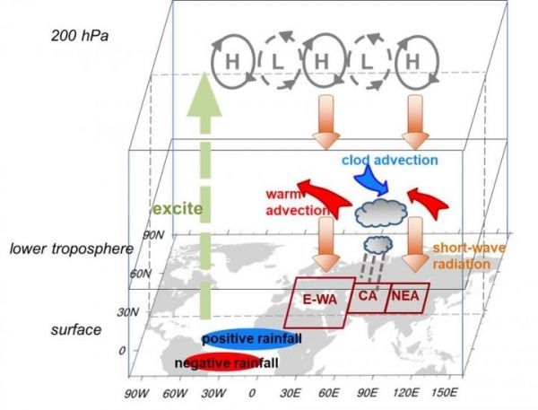 Image: Schematic diagram illustrating the mechanism of the AMO affecting the Eurasian surface temperature. E-WA, CA and NEA are short for Europe-West Asia, Central Asia and Northeast Asia, respectively. H represents 'positive geopotential height anomaly' and L represents 'negative geopotential height anomaly'. (Credit: Xueqian Sun)