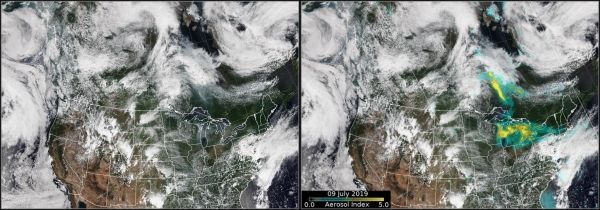Image: Smoke from the Ontario fires continues to affect the Great Lakes region. The image on the left is from the VIIRS instrument aboard that NOAA-20 satellite, and the image on the right is from the OMPS aerosol index overlaid on the VIIRS image. The advanced Ozone Mapping and Profiler Suite (OMPS) tracks the health of the ozone layer and measures the concentration of ozone in the Earth's atmosphere and the yellow areas over the great lakes are aerosols from the wildfire smoke. Credits: NASA/NOAA/Colin Seftor