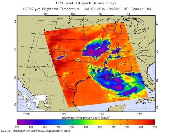 An infrared look by NASA’s Aqua satellite on July 10, 2019 at 3:23 p.m. EDT (1923 UTC) revealed where the strongest storms were located within Potential Tropical Cyclone 2. The Atmospheric Infrared Sounder or AIRS instrument aboard NASA’s Aqua satellite analyzed cloud top temperatures and found cloud top temperatures of strongest thunderstorms as cold as or colder than minus 63 degrees Fahrenheit (minus 53 degrees Celsius) circling the center (which is still not well-defined) and in thunderstorms northwest of the center, extending over southern Louisiana. Cloud top temperatures that cold indicate strong storms that have the capability to create heavy rain.