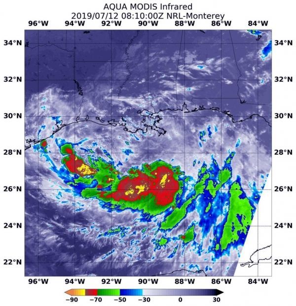 Image: On July 12 at 4:10 a.m. EDT (0810 UTC) the MODIS instrument that flies aboard NASA’s Aqua satellite showed strongest storms in Tropical Storm Barry were south of the elongated center where cloud top temperatures were as cold as minus 70 degrees Fahrenheit (minus 56.6 Celsius). CREDIT: NASA/NRL