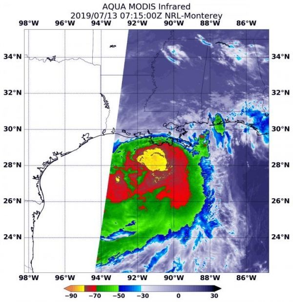 At 3:15 a.m. EDT (0715 UTC) on July 13, the MODIS instrument aboard NASA's Aqua satellite looked at Tropical Storm Barry in infrared light. MODIS found coldest cloud tops (light green) had temperatures near minus 80 degrees Fahrenheit (minus 62.2 degrees Celsius) around the center of the tropical storm which was offshore from south central Louisiana. (Photo Credit: NASA/NRL)