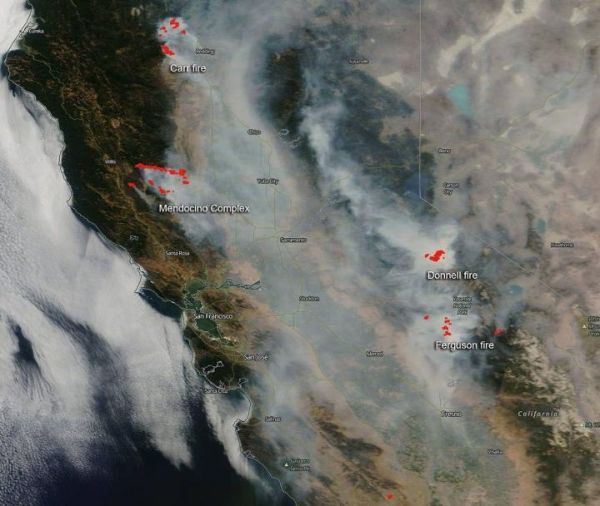 A satellite image, August 6, 2018, shows smoke from multiple large California wildfires. The fires themselves, detected by thermal imagery, are in red. (Photo Credit: NASA)