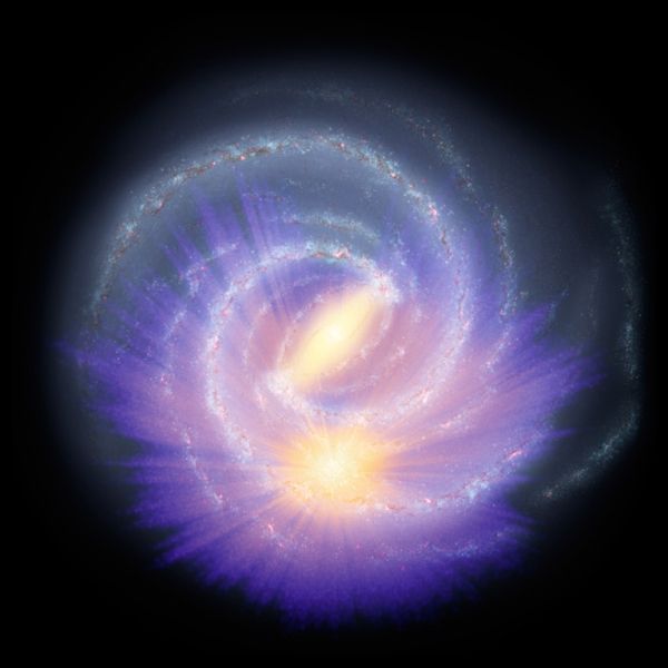 Image: This colour chart, superimposed on an artistic representation of the galaxy, shows the distribution of 150 million stars in the Milky Way probed using data from the second release of ESA’s Gaia mission in combination with infrared and optical surveys, with orange/yellow hues indicating greater density of stars. Most of these stars are red giants. While the majority of charted stars are located closer to the Sun (the larger orange/yellow blob in the lower part of the image), a large and elongated feature populated by many stars is also visible in the central region of the galaxy: this is the first geometric indication of the galactic bar. Credit: ESA/Gaia/DPAC, A. Khalatyan (AIP) & StarHorse Team; mapa artístic de la Galaxia: NASA/JPL-Caltech/R. Hurt (SSC/Caltech)