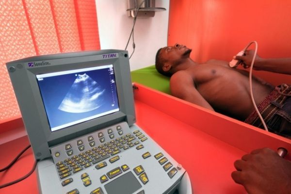 Image: A patient receives an ultrasound at MDaaS Global's clinic in Ibadan, Nigeria. MDaaS provides diagnostic services to low-income communities that were previously inaccessible. Image courtesy of MDaaS Global