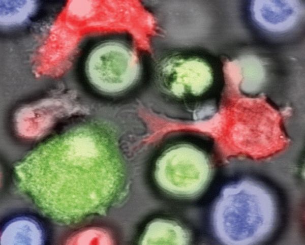 NK cells (red) attack normal leukemia cells (green). Leukemia stem cells (blue), on the other hand, suppress NKG2DL expression at their surface and thus escape destruction by the immune system.