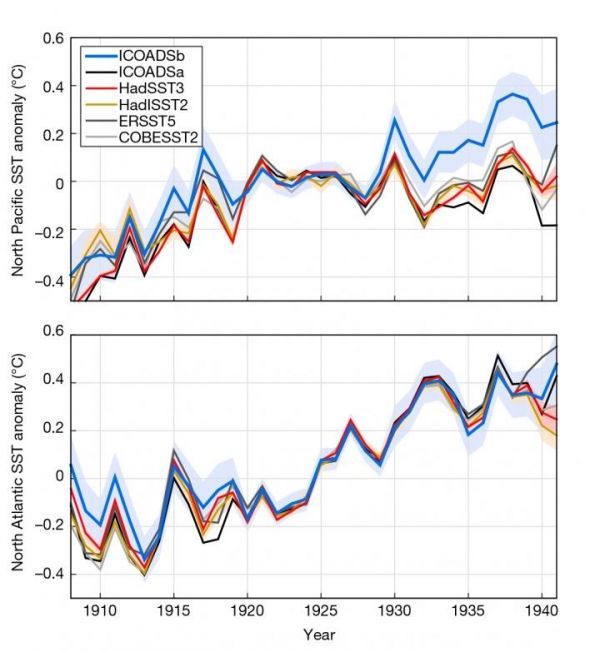 This chart shows annual sea surface temperature changes from different datasets in the North Pacific (top) and North Atlantic (bottom). The blue line indicates the corrected data from this research. It shows greater warming in the North Pacific and less warming in the North Atlantic relative to previous estimates. (Photo Credit: Duo Chan/Harvard)