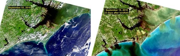 Image: NASA/USGS Landsat satellite images of coastal North Carolina before and after the passage of Hurricane Florence on Sept. 15, 2018. CREDIT: Paerl, Hall, Hounshell, Luettich, Rossignol, Osburn and Bales, 2019.