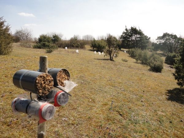 Image: The scientists performed their experiment on chalk grasslands as shown here. The wooden post is fitted with hatching tubes complete with bee cocoons and nesting structures. (Credit: Sandra Kehrberger)