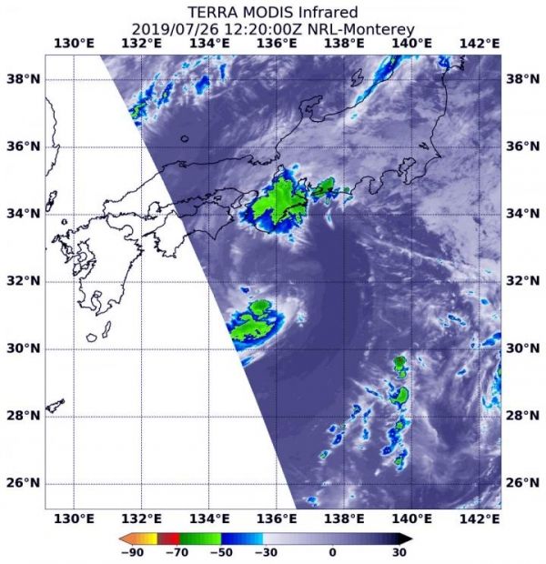 On July 26 at 8:20 a.m. EDT (1220 UTC), the Moderate Imaging Spectroradiometer or MODIS instrument that flies aboard NASA’s Terra satellite gathered infrared data on Nari, formerly known as Tropical Storm 07W. There were two areas of strongest storms in Tropical Storm Nari, and they were north and south of the center of circulation. In those areas, thunderstorms had cloud top temperatures as cold as minus 50 degrees Fahrenheit (minus 45.5 Celsius). That northernmost area of strong storms was located over the Kyoto, Osaka and Wakayama Prefectures of Japan.
