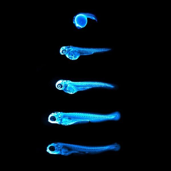 This image captures the bright blue light (chemiluminescence) emitted by the NanoLuc protein in LipoGlo zebrafish. By attaching this glowing enzyme to bad-cholesterol particles, researchers are able to visualize how much cholesterol is present in each fish, and where in the body it resides. The top image shows a zebrafish embryo 24 hours into development, with many cholesterol particles emanating from its large spherical yolk. Subsequent images were taken every 24 hours, showing that cholesterol levels peak between three and four days of age in zebrafish embryos. (Photo Credit: The image is provided courtesy of James Thierer and Ed Hirschmugl)