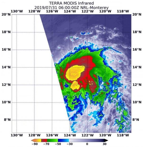 On July 31, 2019 at 6:35 a.m. EDT (1035 UTC), the MODIS instrument that flies aboard NASA's Terra satellite showed strongest storms in Hurricane Flossie were around the center and south of the center where cloud top temperatures were as cold as minus 80 degrees Fahrenheit (minus 62.2 Celsius). (Photo Credit: NASA/NRL)