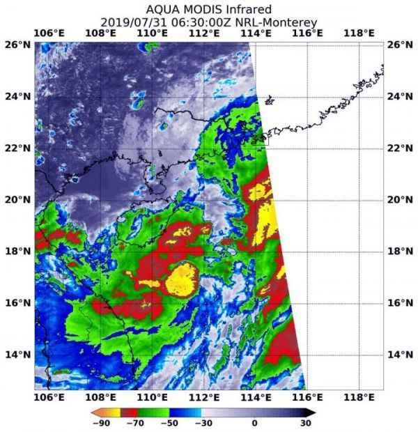 Image: On July 31, 2019 at 2:30 a.m. EDT (0630 UTC) the MODIS instrument that flies aboard NASA's Aqua satellite showed strongest storms in Tropical Storm Wipha were southeast of Hainan Island, China, in the South China Sea. Cloud top temperatures were as cold as minus 80 degrees Fahrenheit (minus 62.2 Celsius). (Credit: NASA/NRL)