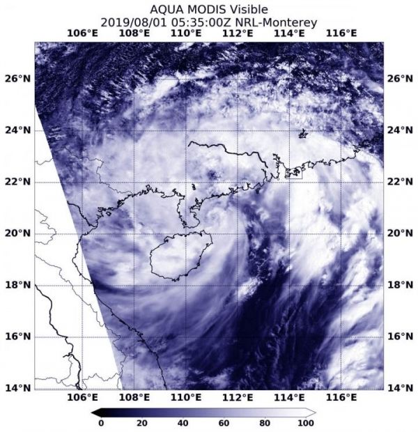On August 1, 2019 at 1:35 a.m. EDT (0535 UTC), the Moderate Resolution Imaging Spectroradiometer or MODIS instrument aboard NASA’s Aqua satellite provided a visible image of Wipha that showed the center of circulation just off the coast of southern China. The center was just east of the southern tip of the Leizhou Peninsula of southern Guangdong province, and northeast of Hainan Island, China. MODIS imagery shows that despite the center in that area, the bands of thunderstorms that circle the center extend over Hainan Island and into the southern Guangdong Province as well as over the South China Sea.