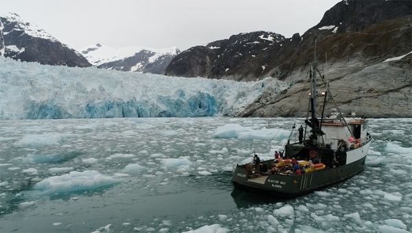 Photo: UO-led research team works on board the MV Steller in front of Alaska’s LeConte Glacier (Photo courtesy of David Sutherland)