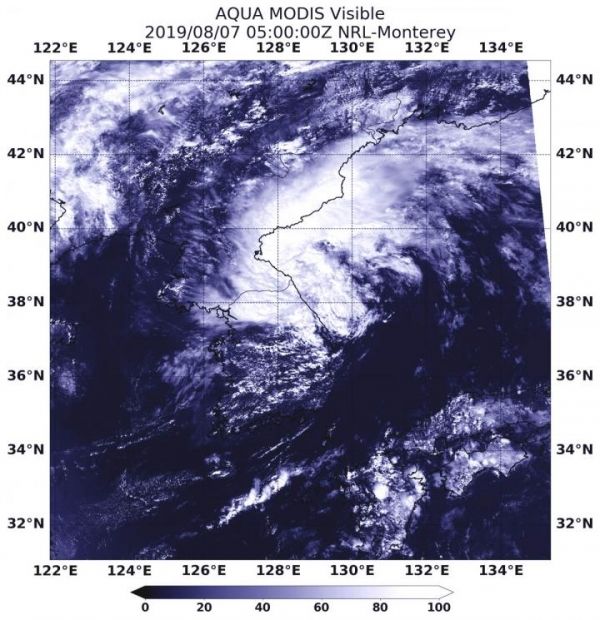 On Aug. 7, 2019 at 1:00 a.m. EDT (0500 UTC), the MODIS instrument aboard NASA's Aqua satellite provided a visible image of Tropical Storm Francisco in the Sea of Japan, along the Korean Peninsula. (Photo Credit: NASA/NRL)