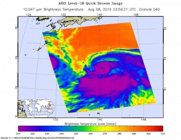 Cloud top temperatures provide information to forecasters about where the strongest storms are located within a tropical cyclone. NASA’s Aqua satellite took Typhoon Krosa’s cloud top temperatures to get that information. NASA’s Aqua satellite analyzed the storm on Aug. 7 at 11 p.m. EDT (0359 UTC) using the Atmospheric Infrared Sounder or AIRS instrument. The stronger the storms, the higher they extend into the troposphere, and they have the colder cloud temperatures. AIRS found coldest cloud top temperatures as cold as or colder than minus 63 degrees Fahrenheit (minus 53 degrees Celsius) around the eye and in large bands south and east of the center. Cloud top temperatures that cold indicate strong storms that have the capability to create heavy rain.