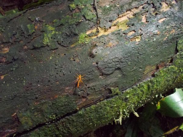 Parasitoid wasps prefer the decaying wood of primary forest. The photo shows a male Epirhyssa ghesquierei rhyssine wasp and a decaying Uvariopsis congensis tree trunk. (Photo Credit: Tapani Hopkins)