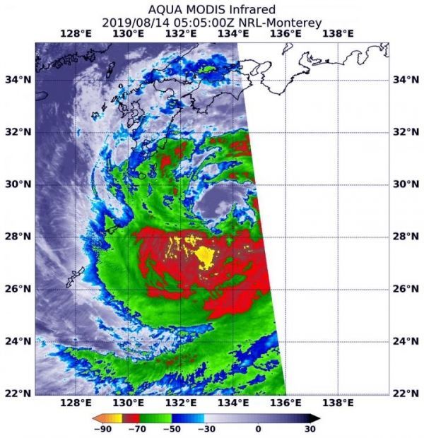 Image: On Aug. 14, 2019 at 12:05 a.m. EDT (0505 UTC), NASA's Aqua satellite found strongest thunderstorms (yellow) in Krosa in a small area southwest of the center where cloud top temperatures were as cold as minus 80 degrees Fahrenheit (minus 62.2 Celsius). That area was surrounded by a much larger area (red) with powerful storms as cold as minus 70 degrees Fahrenheit (minus 56.6 Celsius). (Credit: NASA/NRL)