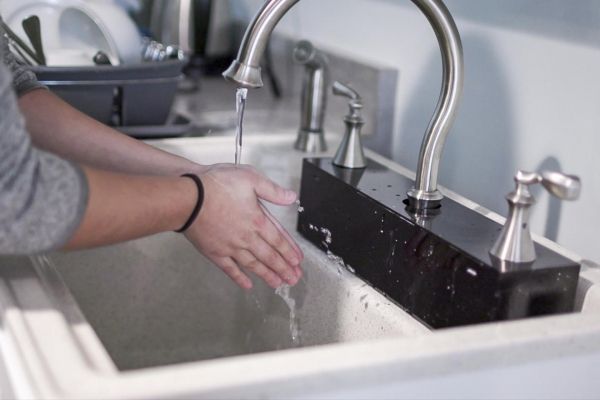 Image: A Stanford experiment with a fake autonomous sink showed that a real smart sink could help conserve water. (Credit: Kurt Hickman/Stanford News Service)