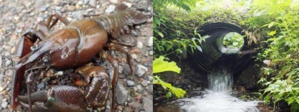 Image: Non-native signal crayfish (left) were found upstream of a 69 cm-high road-crossing culvert (right). (Credit: Kousuke I. et al., Freshwater Science. July 24, 2019)