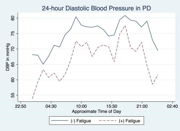 Investigators conducted a cross-sectional study research assessment of 35 people with PD recruited from the Ann Arbor Veterans Affairs Health System, all of whom wore a 24-hour blood pressure monitor to track their blood pressure hourly while they were at home. Researchers asked participants about the presence of fatigue symptoms and grouped them into two categories: those with fatigue and those without.