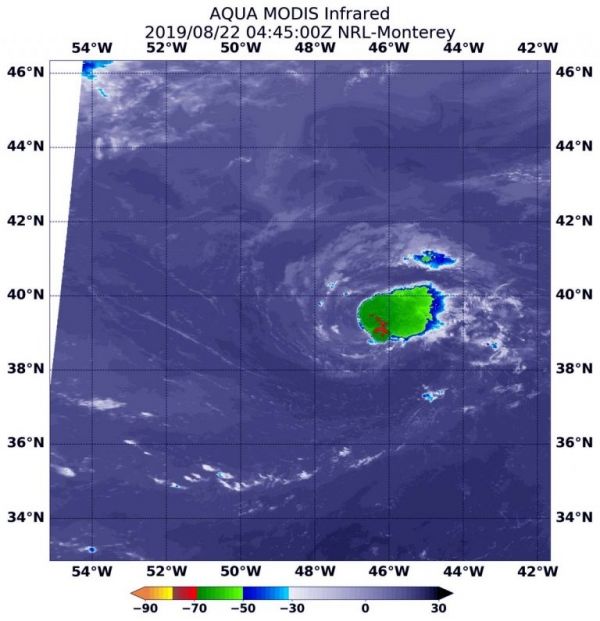 Over the last day, winds outside of Tropical Storm Chantal have been weakening the storm in the North Atlantic Ocean. When NASA’s Aqua satellite passed over the storm from its orbit in space on August 22, the storm had weakened to a depression and strongest storms were still confined to the northeast of the center.