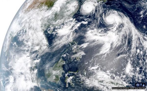 Image: Smoke off the west coast of Borneo and dueling tropical cyclones in the Philippine Sea are shown in this color image from the Advanced Himawari Imager aboard the JAXA Himawari-8 satellite, from August 21st, 2018. (Credit: CIRA/CSU and JAXA/NOAA/NASA)