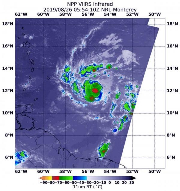 Image: NASA-NOAA's Suomi NPP satellite passed over Tropical Storm Dorian in the western North Atlantic Ocean and the VIIRS instrument aboard captured this image of the storm on Aug. 26 at 1:54 a.m. EDT (0554 UTC). Coldest (red) cloud top temperatures were as cold as minus 70 degrees Fahrenheit (minus 56.6 Celsius). (Credit: NASA/NRL)