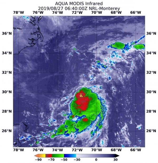 On August 27 at 2:40 a.m. EDT (0640 UTC) the MODIS instrument that flies aboard NASA's Aqua satellite showed a very small area of strongest storms (yellow) in Tropical Depression 6's center where cloud top temperatures were as cold as minus 80 degrees Fahrenheit (minus 62.2 Celsius). (Photo Credit: NASA/NRL)