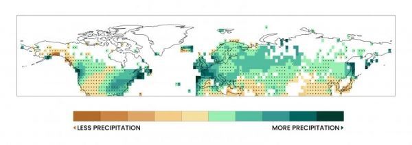 The results show that warming temperatures associated with human emissions of greenhouse gases spurred a noticeable increase in wintertime precipitation across widespread regions of northern Eurasia and eastern North America since 1920.
