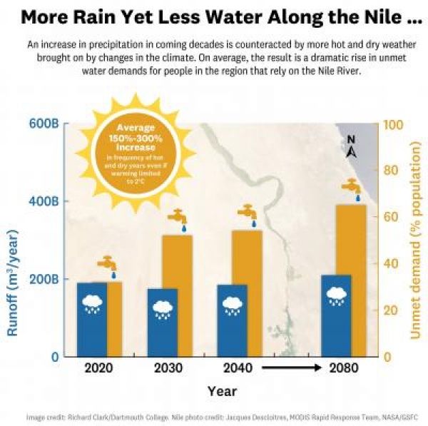 An increase in precipitation in coming decades is counteracted by more hot and dry weather brought on by changes in the climate. On average, the result is a dramatic rise in unmet water demands for people in the region that rely on the Nile River. (Photo Credit: Richard Clark/Dartmouth College. Nile River map is credit: Jacques Descloitres, NASA/GSFC)