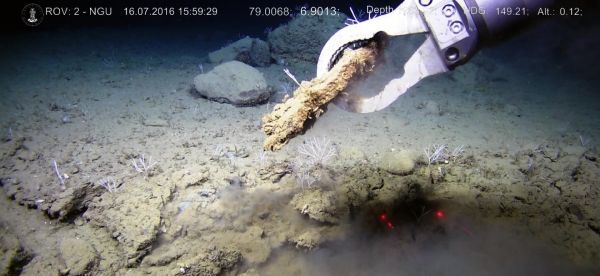 The manipulator arm of the ROV Ægir 6000 samples seep carbonates from the seabed at 1200 m water depth, off western Svalbard. (Photo Credit: NORCRUST)