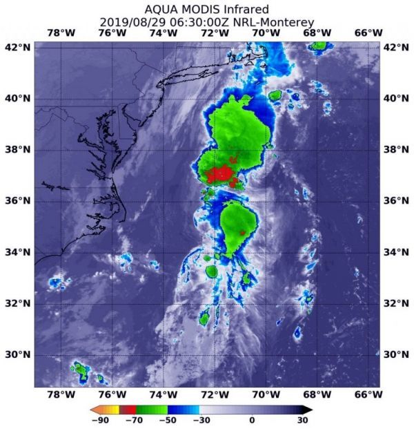 On Aug. 29 at 2:30 a.m. EDT (630 UTC), the Moderate Imaging Spectroradiometer or MODIS instrument that flies aboard NASA’s Aqua satellite used infrared light and found strongest thunderstorms associated with Erin where confined to a small area around the center. There, cloud top temperatures were as cold as minus 50 degrees Fahrenheit (minus 45.5 degrees Celsius). Infrared data provides temperature information, and the strongest thunderstorms that reach high into the atmosphere have the coldest cloud top temperatures.