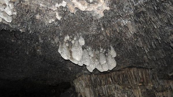 Image: A closeup of the bulbous stalactitic feature of a phreatic overgrowth on speleothems (POS). (Credit: University of New Mexico)