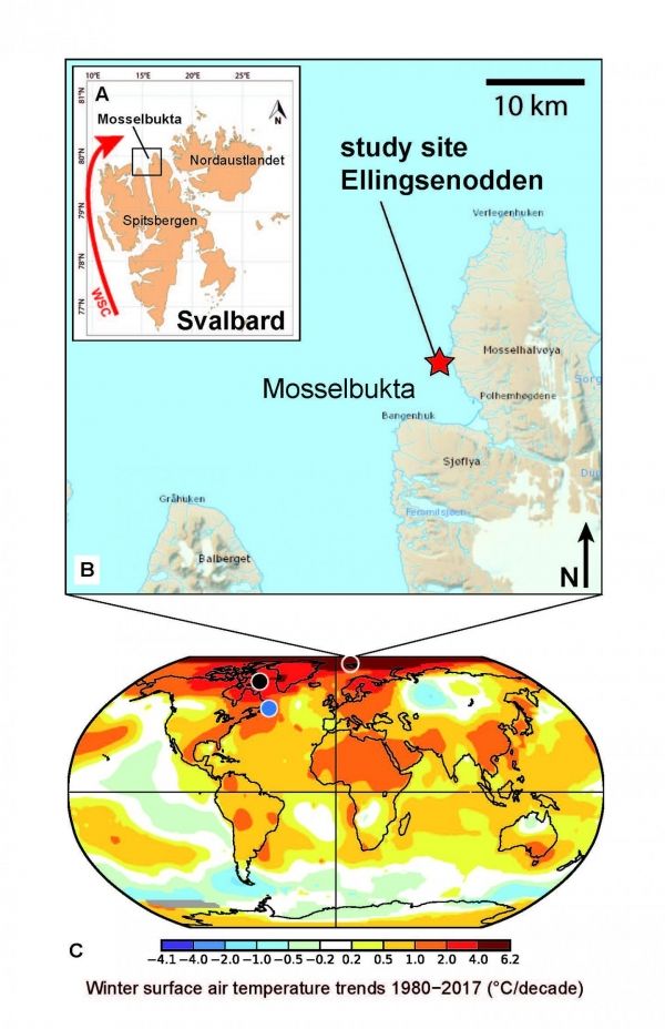 Image: Study area and surface air temperature trends. (A) Map of Svalbard archipelago in the arctic North Atlantic, with location of Mosselbukta study site in northern Spitsbergen (rectangle, enlarged in B), where long-lived encrusting coralline algal buildups were collected in June 2016. Red arrow indicates approximate path of West Spitsbergen Current (WSC). (B) Detailed shaded-relief map of study site with sampling location Ellingsenodden in Mosselbukta (red asterisk). Source of shaded-relief map: https://toposvalbard.npolar.no/. (C) Global winter surface-air temperature trends since C.E. 1980 (linear trends in °C/decade for December-February). Geographic locations of the Svalbard archipelago (this study, white open circle), Newfoundland, Canada (Hill and Jones [1990] sea-ice record, blue circle), and Labrador-Canadian Arctic (Halfar et al. [2013] algal sea-ice proxy, black circle) are shown. Data source: http://data.giss.nasa.gov/gistemp. (Credit: Hetzinger et al. and Geology)