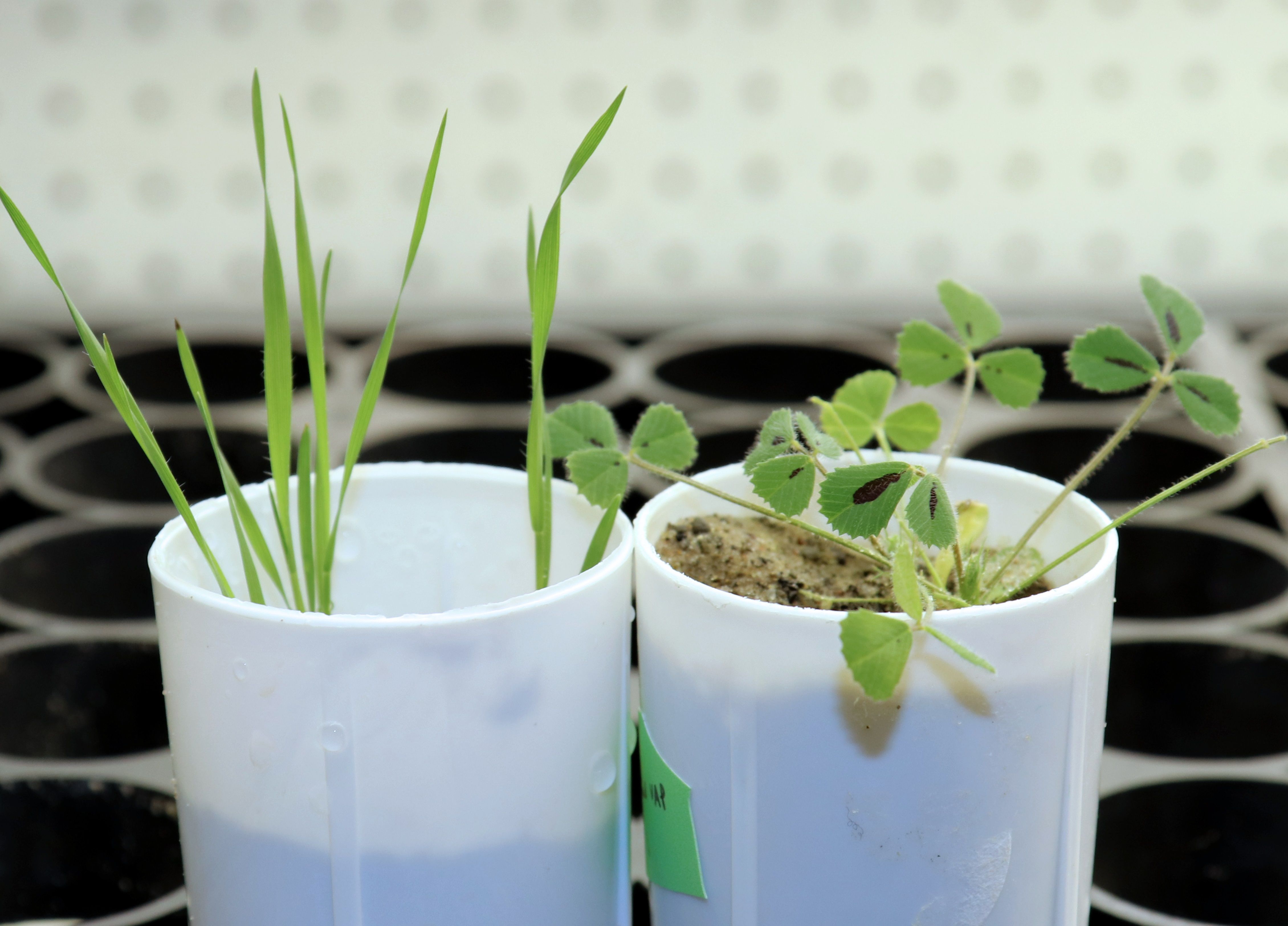 Image: BTI researchers used Brachypodium distachyon (left) and Medicago truncatula (right) to discover the roles of two genes in root colonization by symbiotic fungi.