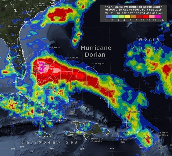 In the early hours of Tuesday, September 3, Hurricane Dorian had been stationary over the island of Grand Bahama for 18 hours, most of the time as a category 5 hurricane. Storm-total rain accumulation over parts of Grand Bahama and Abaco Islands have exceeded 24 inches according to NASA satellite-based estimates.