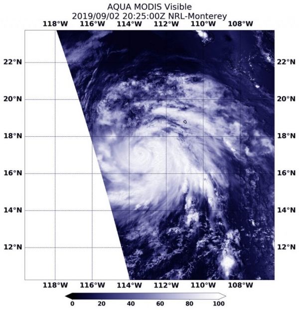 Image: On Sept. 2, 2019 at 4:25 p.m. EDT (2025 UTC) the MODIS instrument aboard NASA’s Aqua satellite provided a visible image of Hurricane Juliette in the Eastern Pacific Ocean as its eye began to show. Credit: NASA/NRL