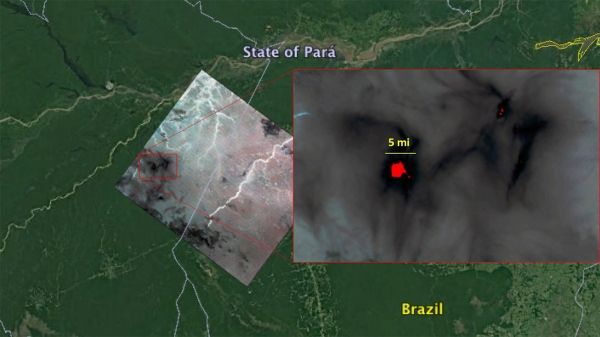 The red areas in the images — in eastern Bolivia and northern Brazil — are where surface temperatures exceeded the maximum measurable temperature of the instrument's sensor (approximately 220 degrees Fahrenheit, or 104 degrees Celsius), highlighting the burning areas along the fire fronts. The dark, wispy areas indicate thick smoke — thick enough to obscure much of the fire from view. The measurements cover areas of about 77 by 77 yards (70 by 70 meters) each, or about the size of a football field.