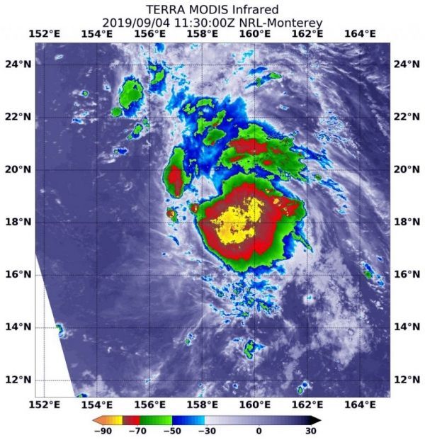 The Joint Typhoon Warning Center noted that, “Satellite imagery shows a partially exposed low-level circulation center with an area of deep convection (thunderstorms) offset to the east of the center.” Just as on Sept. 3, the low-level circulation center of the storm remained exposed to outside westerly winds so the strongest thunderstorms continue to be pushed to the eastern side of the storm.