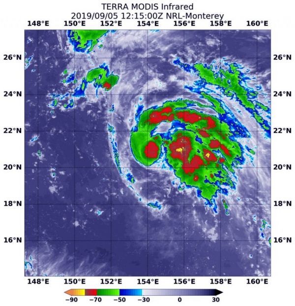 On Sept. 5 at 8:15 a.m. EDT (1215 UTC), the Moderate Imaging Spectroradiometer or MODIS instrument that flies aboard NASA’s Terra satellite found strongest thunderstorms had cloud top temperatures as cold as or colder than minus 70 degrees Fahrenheit (minus 56.6 Celsius). Those temperatures were in cloud tops of storms around the low-level center of circulation and in a thick band of thunderstorms that wrapped around the storm from west to north to east. Cloud top temperatures that cold indicate strong storms with the potential to generate heavy rainfall.