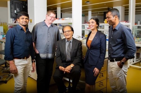 Photo: The Molecular Engineering Group at RMIT: Ganga Reddy Velma, Dr Steven Priver, Distinguished Professor Suresh Bhargava, Dr Neda Mirzadeh, Dr Srinivasareddy Telukutla. CREDIT: RMIT University