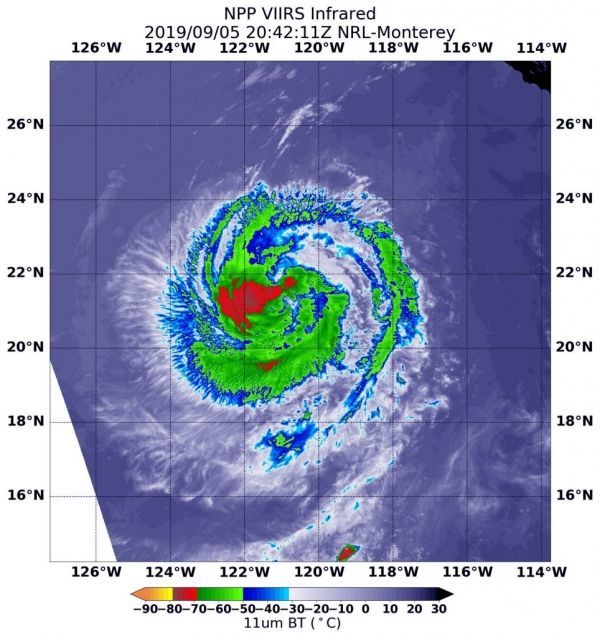 Image: NASA-NOAA’s Suomi NPP satellite passed over Hurricane Juliette in the eastern Pacific Ocean and the VIIRS instrument aboard captured an image of the storm on Sept. 6 at 4:42 p.m. EDT (20:42 UTC). Coldest (red) cloud top temperatures were as cold as minus 70 degrees Fahrenheit (minus 56.6 Celsius). CREDIT: NASA/NOAA/NRL