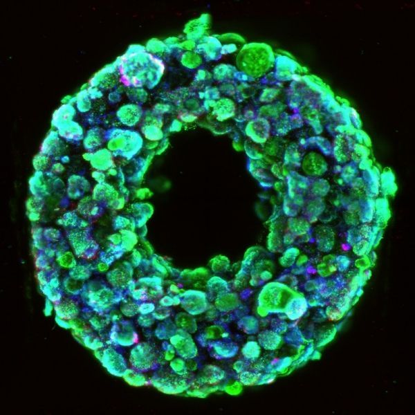 Living embryoid bodies surround a hollow vascular channel printed using the SWIFT method. (Photo Credit: Wyss Institute at Harvard University)