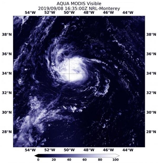 Image: On Sept. 8, 2019 at 2:35 p.m. EDT (1635 UTC) the MODIS instrument aboard NASA's Aqua satellite provided a visible image of Gabrielle moving through the Central Atlantic Ocean. (Credit: NASA/NRL)