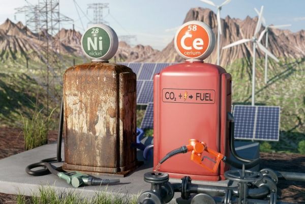 Artistic representation of a nickel-based electrode as a broken down fuel pump and of a cerium-based electrode as a new, productive pump. (Photo Credit: Cube3D)
