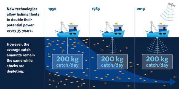 Researchers from the Sea Around Us initiative at the University of British Columbia analyzed more than 50 studies related to the increase in vessels’ catching power and found that the introduction of mechanisms such as GPS, fishfinders, echo-sounders or acoustic cameras, has led to an average two per cent yearly increase in boats’ capacity to capture fish.